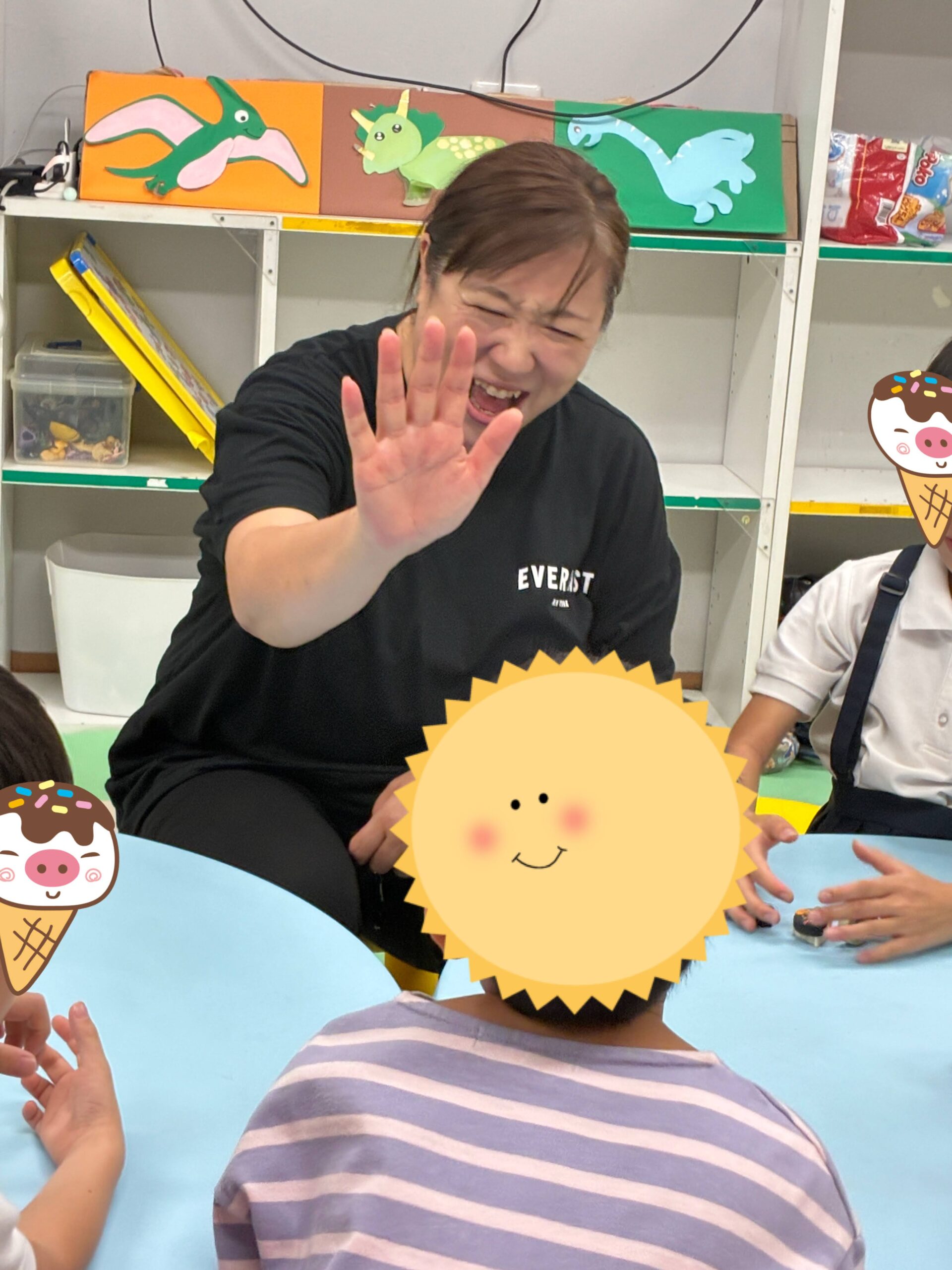 「Hello」の元気な声や、身体いっぱいで表現する姿があふれていて、笑顔の絶えない時間になっています。